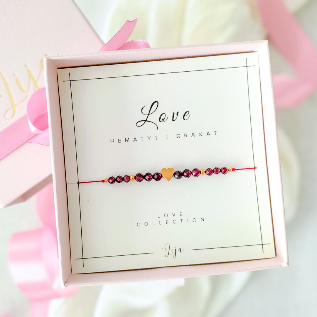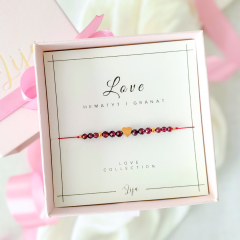 Bransoletka LOVE zawiera GRANAT – kamień nadziei i odwagi. Potęguje siłę i wytrwałość, wspomaga w przezwyciężaniu trudności oraz pomaga otworzyć się na zmiany. Sprzyja on również bogactwu i obfitości, pomaga w realizacji celów i osiąganiu sukcesów. Granat jest kamieniem silnej woli.