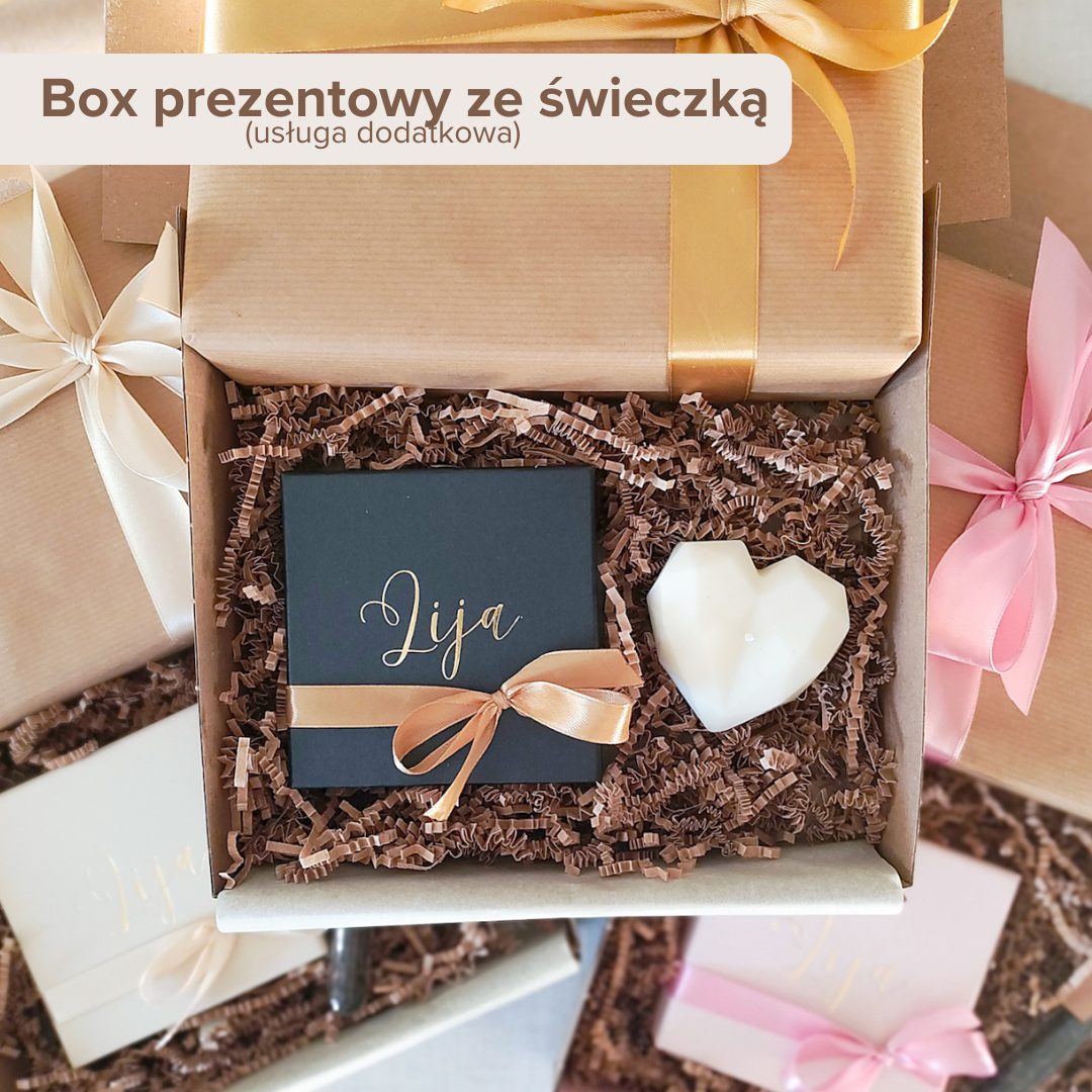 Chcesz aby Twój prezent - bransoletka zawierał dodatkowy upominek? Przygotujemy dla Ciebie zestaw prezentowy, w którym oprócz wybranej przez Ciebie bransoletki znajdować się będzie fiolka z herbatą lub świeczka. Zestaw prezentowy zapakujemy w wybrany przez Ciebie wariant kolorystyczny: beżowy, pudrowy róż, złoty, czerwony lub zielony wykorzystując do tego pakowy papier kraftowy i szeroką wstążkę w odpowiednim kolorze. W opakowaniu znajdować się będzie pudełko jubilerskie z bransoletką, udekorowane wstążeczką oraz fiolka z herbatą lub świeczka, zabezpieczone wiórkami kraftowymi i dobraną kolorystycznie bibułą.