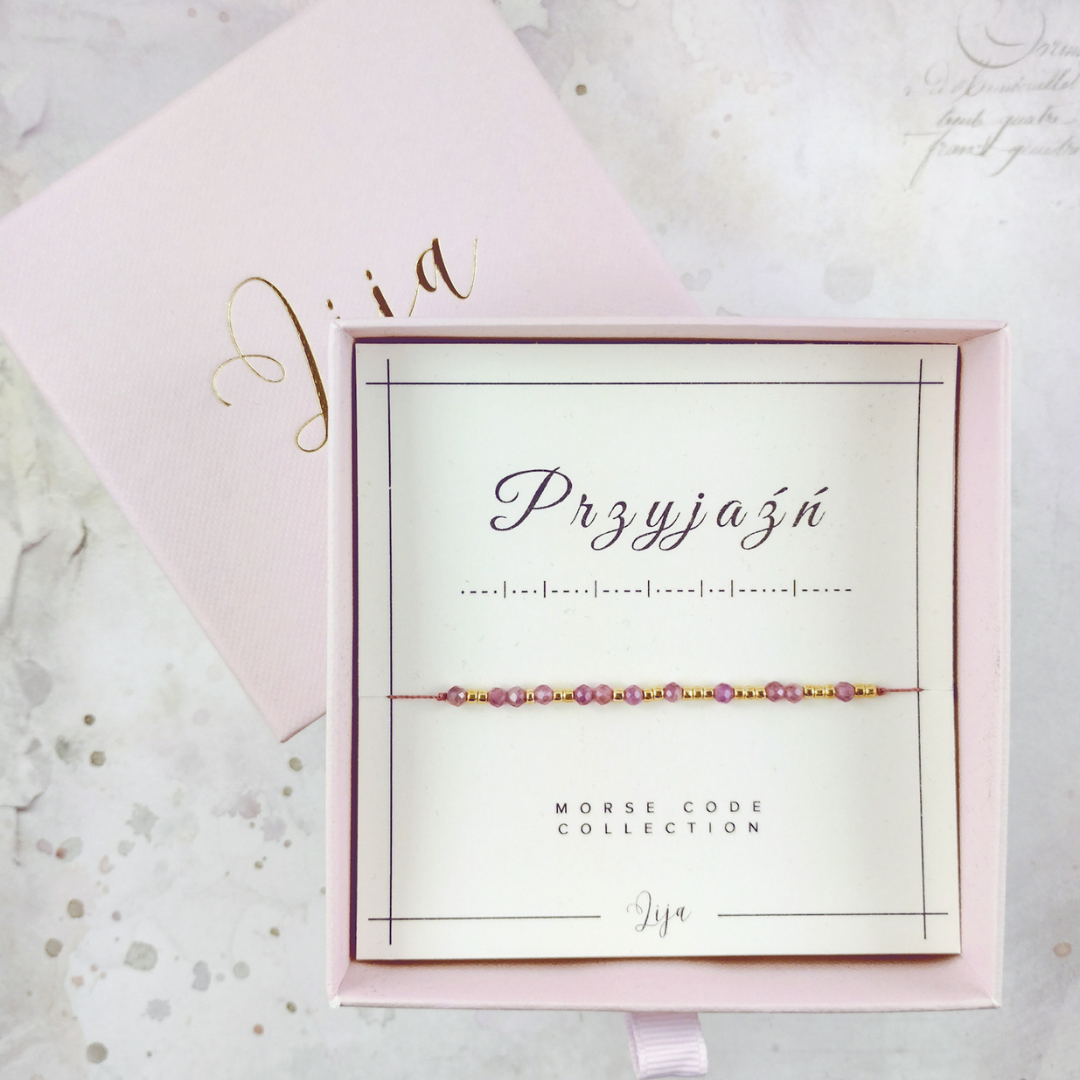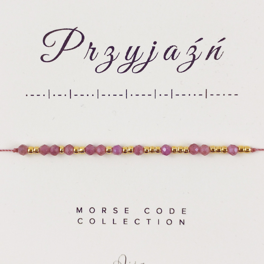 Idealny prezent dla przyjaciółki. Chcesz zakodować Alfabetem Morse'a inne słowo? Podoba Ci się inna kolorystyka? Skorzystaj z oferty, gdzie możesz wybrać słowo, kamień i kolor nici.