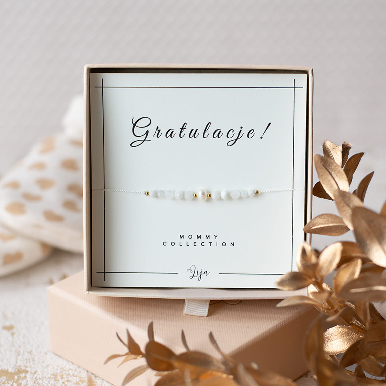 Chcesz aby bransoletka była gotowa do wręczenia na prezent? Zapakujemy ją w wybrany przez Ciebie wariant kolorystyczny: beżowy, pudrowy róż, złoty, czerwony lub zielony. Prezent zapakowany będzie w kraftowy papier pakowy i przewiązany szeroką wstążką w odpowiednim kolorze. W opakowaniu znajdować się będzie pudełko jubilerskie z bransoletką, udekorowane wstążeczką oraz zabezpieczone wiórkami kraftowymi i dobraną kolorystycznie bibułą.