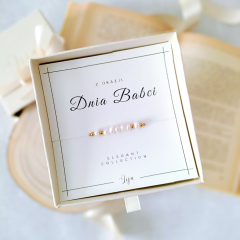 Bransoletka jest zapakowana w eleganckie pudełko jubilerskie w postaci szufladki z pozłacanym logo, w trzech wariantach kolorystycznych do wyboru: czarny, beżowy lub pudrowy róż. Wewnątrz pudełka znajduje się karteczka z nazwą kolekcji oraz napis - Z okazji Dnia Babci. Na odwrocie zaś można znaleźć opis właściwości danego kamienia.