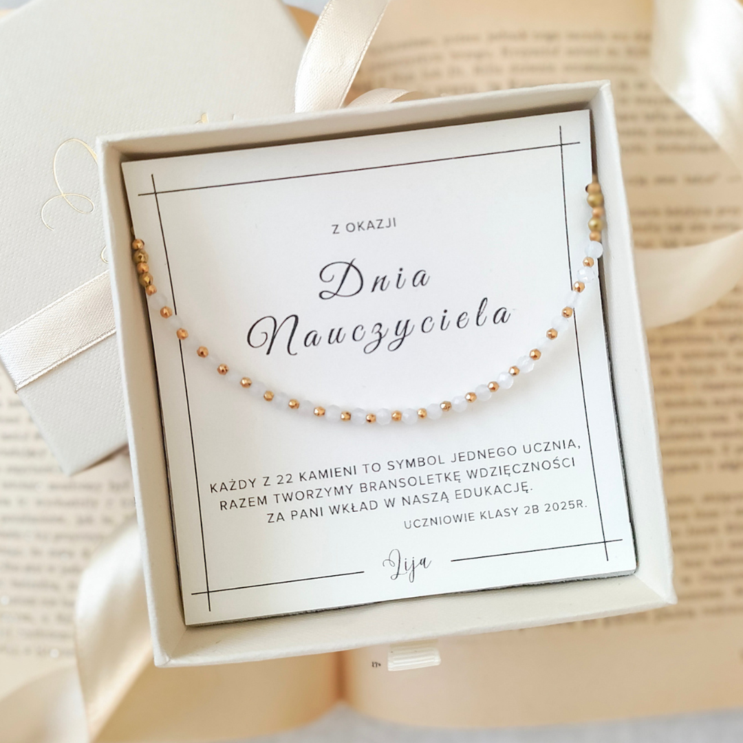 KOLEKCJA WDZIĘCZNOŚĆ (Gratitude Collection) gdzie każdy kamień symbolizuje jedno dziecko – razem tworzą niepowtarzalną bransoletkę, będącą podziękowaniem za serce, cierpliwość i trud włożony w edukację oraz wychowanie. To nie tylko biżuteria, ale przede wszystkim wzruszająca pamiątka, która przypomina nauczycielce, że każdy jej wysiłek miał znaczenie i zostawił trwały ślad w życiu uczniów. Bransoletka z kolekcji Wdzięczność sprawdzi się idealnie jako prezent na Dzień Nauczyciela lub na zakończenie roku szkolnego, kiedy uczniowie chcą wyrazić swoją wdzięczność w wyjątkowy sposób.
