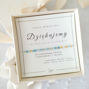 Bransoletka z akwamarynem DZIĘKUJĘ/DZIĘKUJEMY kodowane alfabetem Morse’a – prezent dla nauczycielki, pani z przedszkola lub cioci ze żłobka – Dzień Nauczyciela, zakończenie roku