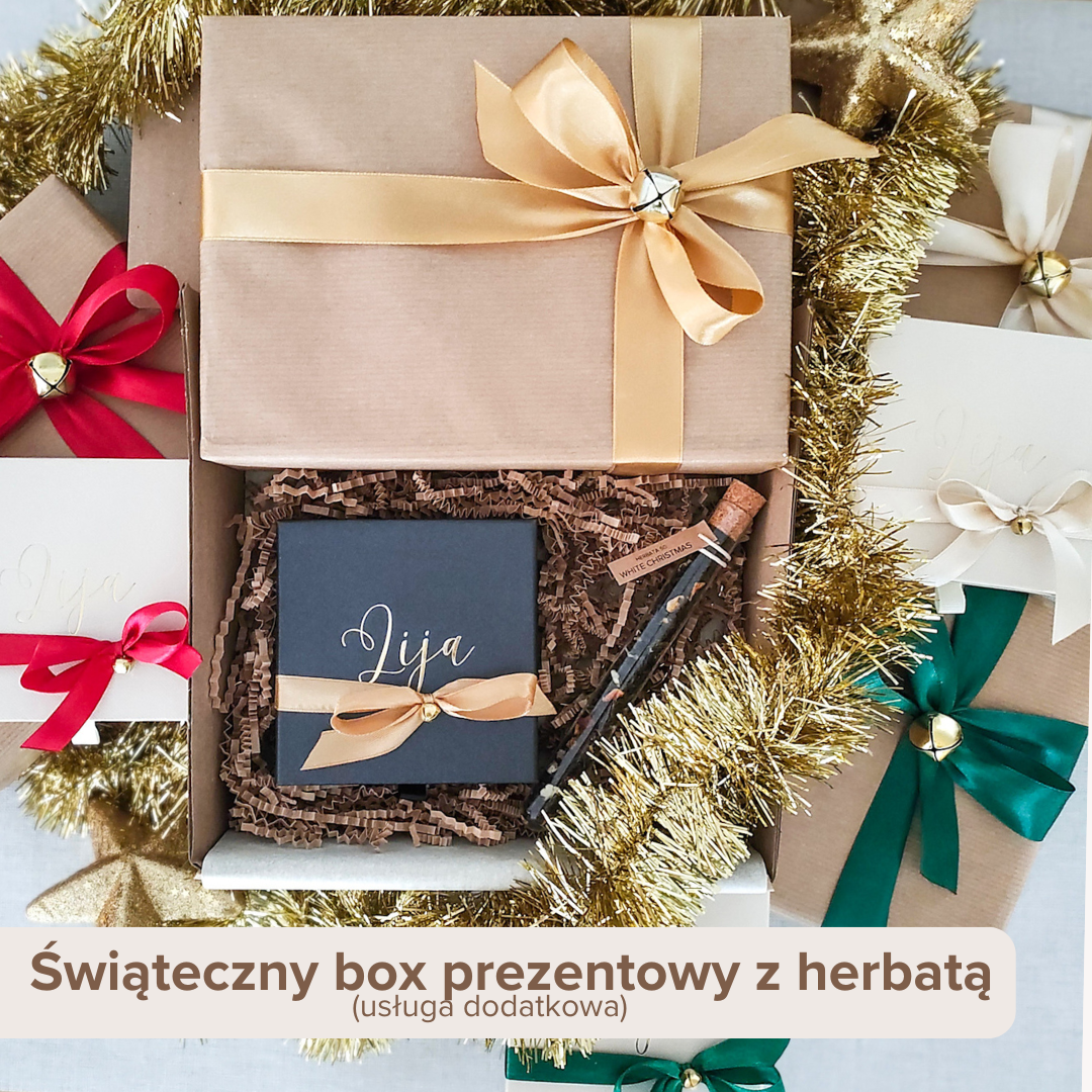 Chcesz aby Twój prezent - bransoletka zawierał dodatkowy upominek? Przygotujemy dla Ciebie zestaw prezentowy, w którym oprócz wybranej przez Ciebie bransoletki znajdować się będzie fiolka z herbatą lub świeczka. Zestaw prezentowy zapakujemy w wybrany przez Ciebie wariant kolorystyczny: beżowy, pudrowy róż, złoty, czerwony lub zielony wykorzystując do tego pakowy papier kraftowy i szeroką wstążkę w odpowiednim kolorze. W opakowaniu znajdować się będzie pudełko jubilerskie z bransoletką, udekorowane wstążeczką oraz fiolka z herbatą lub świeczka, zabezpieczone wiórkami kraftowymi i dobraną kolorystycznie bibułą.