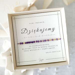 Bransoletka z ametystem DZIĘKUJĘ/DZIĘKUJEMY kodowane alfabetem Morse’a – prezent dla nauczycielki, pani z przedszkola lub cioci ze żłobka – Dzień Nauczyciela, zakończenie roku
