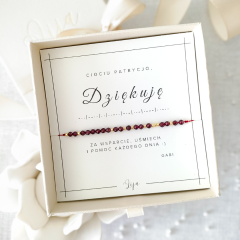 Chcesz aby bransoletka była gotowa do wręczenia na prezent? Zapakujemy ją w wybrany przez Ciebie wariant kolorystyczny: beżowy, pudrowy róż, złoty, czerwony lub zielony. Prezent zapakowany będzie w kraftowy papier pakowy i przewiązany szeroką wstążką w odpowiednim kolorze. W opakowaniu znajdować się będzie pudełko jubilerskie z bransoletką, udekorowane wstążeczką oraz zabezpieczone wiórkami kraftowymi i dobraną kolorystycznie bibułą.