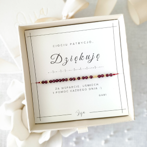Bransoletka z granatem DZIĘKUJĘ/DZIĘKUJEMY kodowana alfabetem Morse’a – prezent dla nauczycielki, pani z przedszkola lub cioci ze żłobka – Dzień Nauczyciela, zakończenie roku