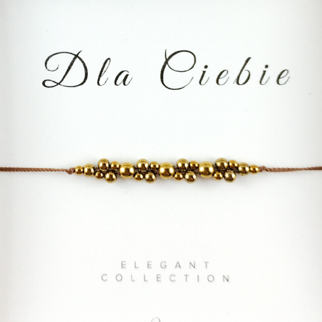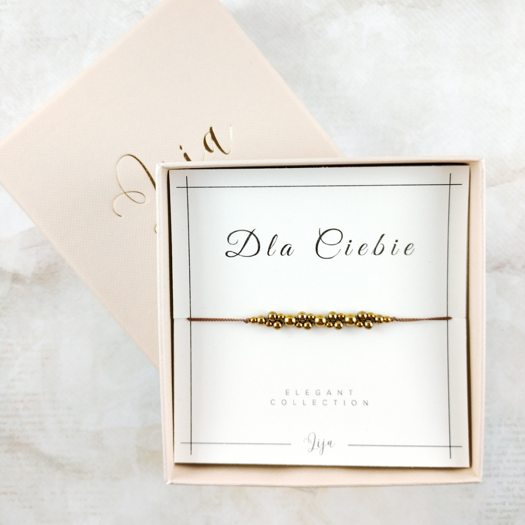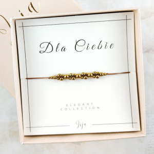 Chcesz aby bransoletka była gotowa do wręczenia na prezent? Zapakujemy ją w wybrany przez Ciebie wariant kolorystyczny: beżowy, pudrowy róż, złoty, czerwony lub zielony. Prezent zapakowany będzie w kraftowy papier pakowy i przewiązany szeroką wstążką w odpowiednim kolorze. W opakowaniu znajdować się będzie pudełko jubilerskie z bransoletką, udekorowane wstążeczką oraz zabezpieczone wiórkami kraftowymi i dobraną kolorystycznie bibułą.