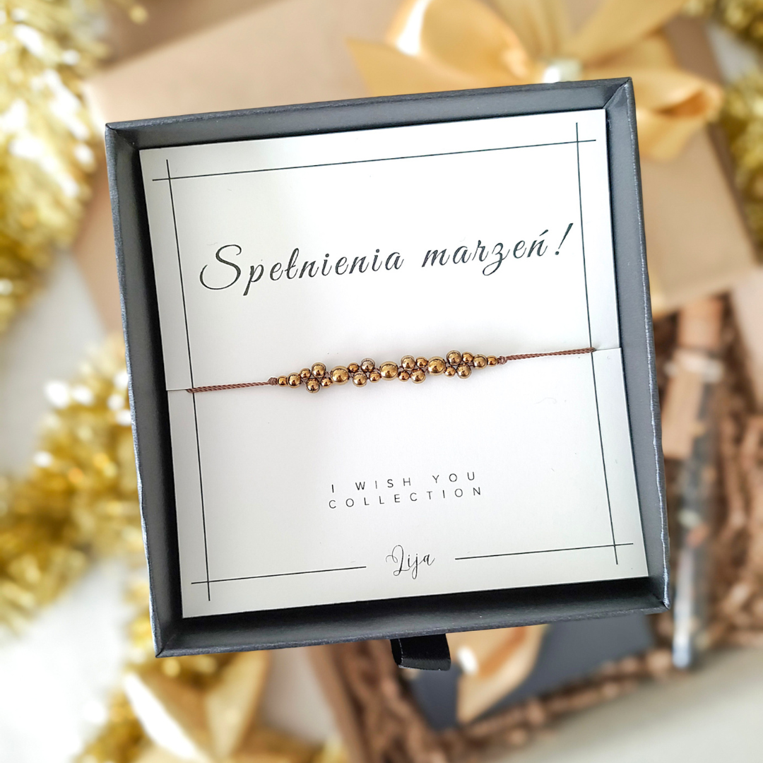 Chcesz aby bransoletka była gotowa do wręczenia na prezent? Zapakujemy ją w wybrany przez Ciebie wariant kolorystyczny: beżowy, pudrowy róż, złoty, czerwony lub zielony. Prezent zapakowany będzie w kraftowy papier pakowy i przewiązany szeroką wstążką w odpowiednim kolorze. W opakowaniu znajdować się będzie pudełko jubilerskie z bransoletką, udekorowane wstążeczką oraz zabezpieczone wiórkami kraftowymi i dobraną kolorystycznie bibułą.
