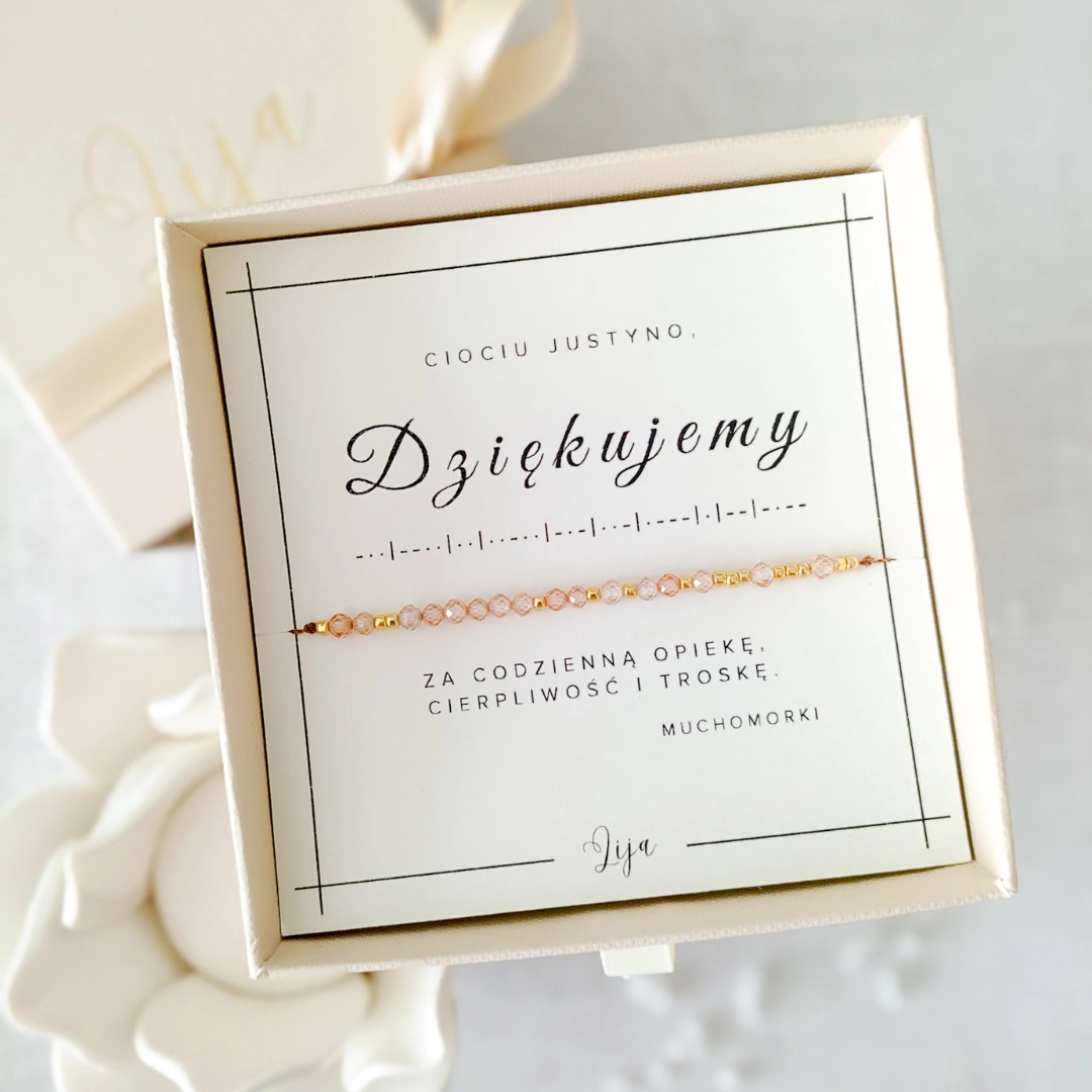 Bransoletka z zakodowanym słowem DZIĘKUJĘ lub DZIĘKUJEMY to idealny prezent na zakończenie przedszkola, żłobka, szkoły czy na Dzień Nauczyciela. Świetnie sprawdzi się jako podziękowanie dla pani ze szkoły, pani z przedszkola czy dla cioci ze żłobka. To oryginalna i piękna biżuteria, która wyrazi Twoją wdzięczność w wyjątkowy sposób.