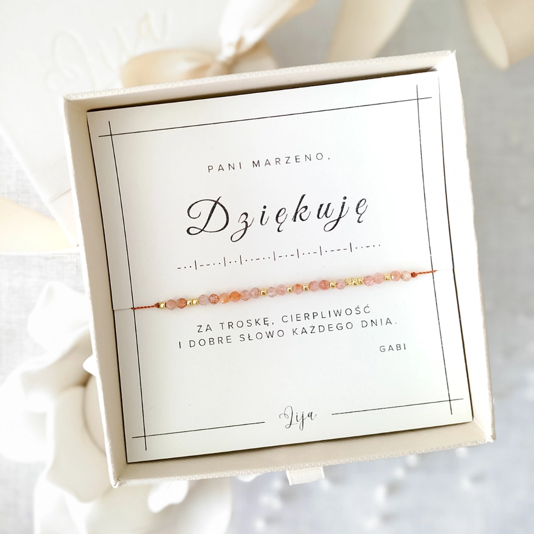 Bransoletka z kamieniem słonecznym DZIĘKUJĘ/DZIĘKUJEMY kodowana alfabetem Morse’a – prezent dla nauczycielki, pani z przedszkola lub cioci ze żłobka – Dzień Nauczyciela, zakończenie roku