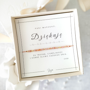 Chcesz aby bransoletka była gotowa do wręczenia na prezent? Zapakujemy ją w wybrany przez Ciebie wariant kolorystyczny: beżowy, pudrowy róż, złoty, czerwony lub zielony. Prezent zapakowany będzie w kraftowy papier pakowy i przewiązany szeroką wstążką w odpowiednim kolorze. W opakowaniu znajdować się będzie pudełko jubilerskie z bransoletką, udekorowane wstążeczką oraz zabezpieczone wiórkami kraftowymi i dobraną kolorystycznie bibułą.