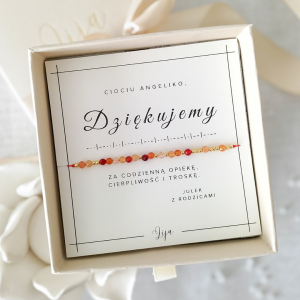 Bransoletka z karneolem DZIĘKUJĘ/DZIĘKUJEMY kodowana alfabetem Morse’a – prezent dla nauczycielki, pani z przedszkola lub cioci ze żłobka – Dzień Nauczyciela, zakończenie roku