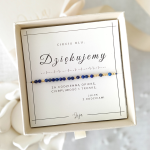 Bransoletka z lapis lazuli DZIĘKUJĘ/DZIĘKUJEMY kodowana alfabetem Morse’a – prezent dla nauczycielki, pani z przedszkola lub cioci ze żłobka – Dzień Nauczyciela, zakończenie roku