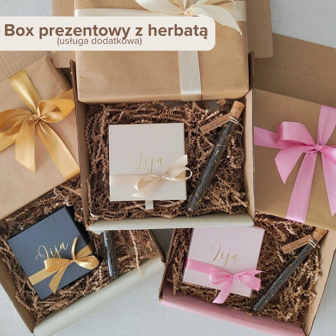 Chcesz aby Twój prezent - bransoletka zawierał dodatkowy upominek? Przygotujemy dla Ciebie zestaw prezentowy, w którym oprócz wybranej przez Ciebie bransoletki znajdować się będzie fiolka z herbatą lub świeczka. Zestaw prezentowy zapakujemy w wybrany przez Ciebie wariant kolorystyczny: beżowy, pudrowy róż, złoty, czerwony lub zielony wykorzystując do tego pakowy papier kraftowy i szeroką wstążkę w odpowiednim kolorze. W opakowaniu znajdować się będzie pudełko jubilerskie z bransoletką, udekorowane wstążeczką oraz fiolka z herbatą lub świeczka, zabezpieczone wiórkami kraftowymi i dobraną kolorystycznie bibułą.