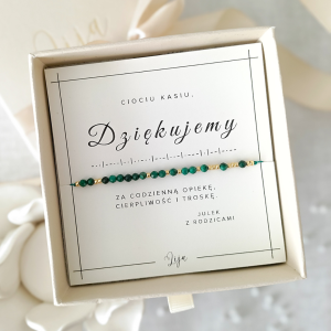 Bransoletka z malachitem DZIĘKUJĘ/DZIĘKUJEMY kodowane alfabetem Morse’a – prezent dla nauczycielki, pani z przedszkola lub cioci ze żłobka – Dzień Nauczyciela, zakończenie roku