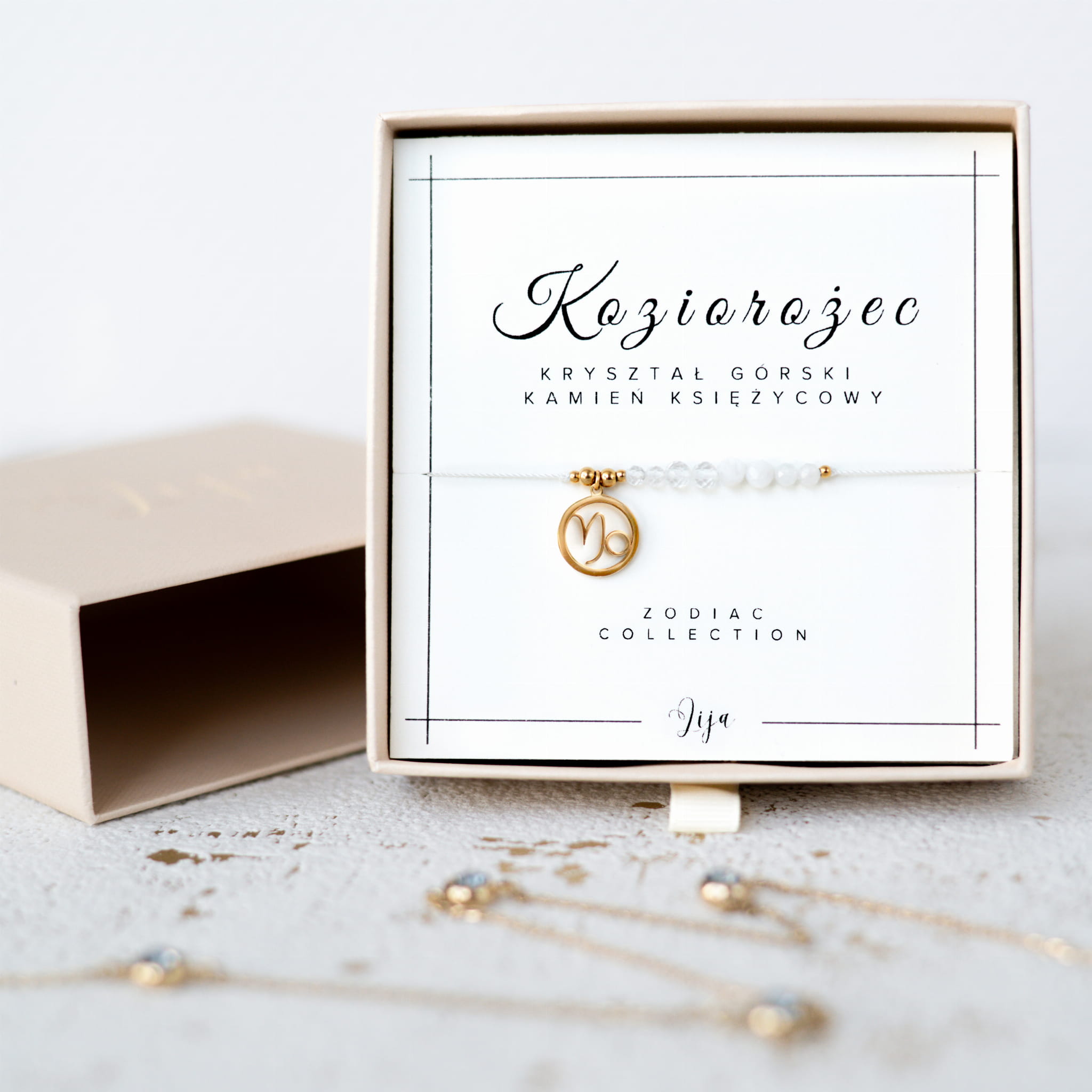 Bransoletka jest zapakowana w eleganckie pudełko jubilerskie w postaci szufladki z pozłacanym logo, w trzech wariantach kolorystycznych do wyboru: czarny, beżowy lub pudrowy róż. Wewnątrz pudełka znajduje się karteczka z nazwą kolekcji, znaku zodiaku oraz dedykowanych kamieni. Na odwrocie zaś można znaleźć opis właściwości danych kamieni.