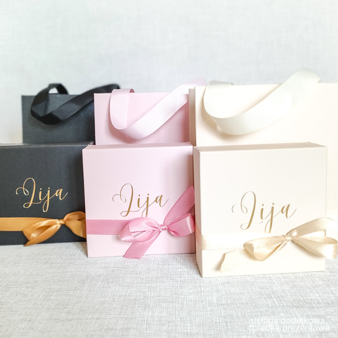 Wybierając tę opcję, bransoletka dla uczestniczek wieczoru panieńskiego zostanie zapakowana w pudełko – tak jak inne bransoletki marki Lija – zamiast w standardową kopertkę. Całość dopełnia dopasowana kolorystycznie wstążka z kokardką, która nadaje opakowaniu wyjątkowo prezentowy charakter.
