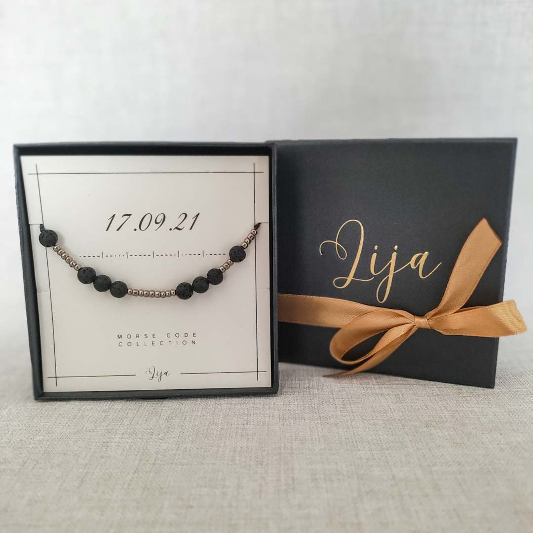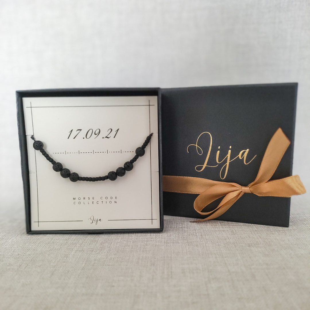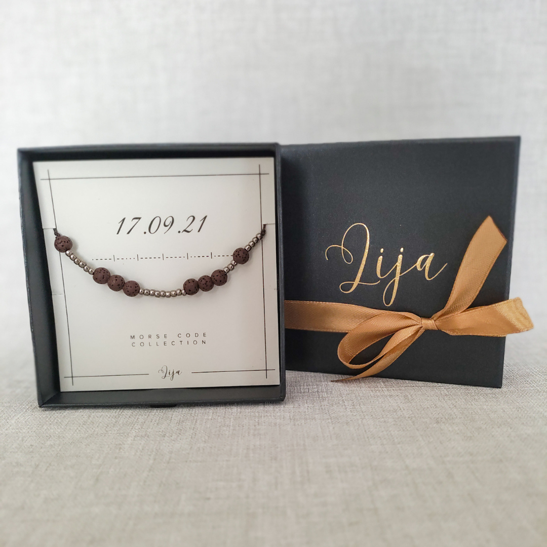 Bransoletka jest zapakowana w eleganckie pudełko jubilerskie w postaci szufladki z pozłacanym logo, w trzech wariantach kolorystycznych do wyboru: beżowy lub pudrowy róż. Wewnątrz pudełka znajduje się karteczka z nazwą kolekcji, wybraną przez Ciebie datę oraz jej odpowiednik zakodowany alfabetem Morse'a. Na odwrocie zaś można znaleźć opis właściwości lawy wulkanicznej.