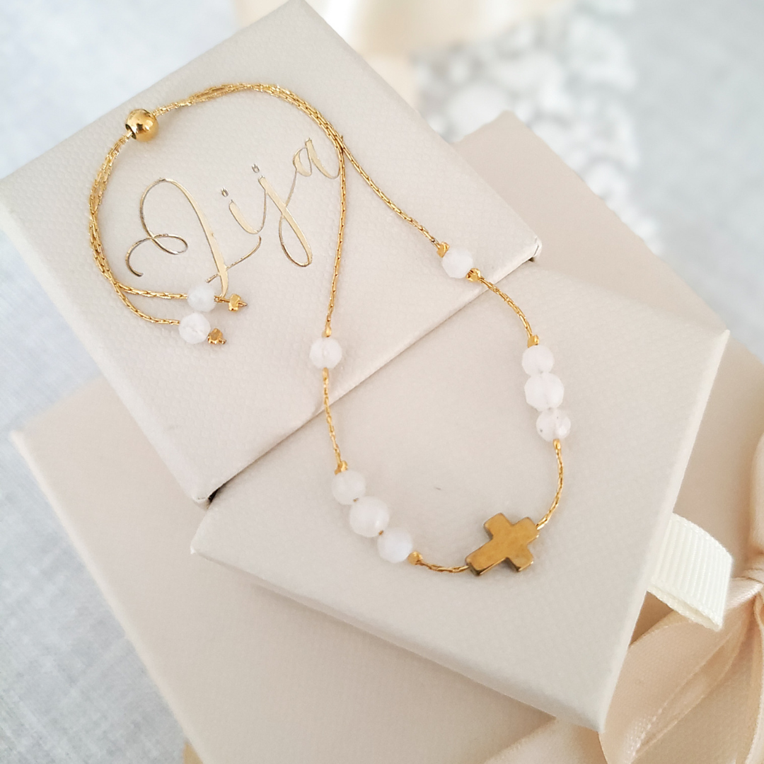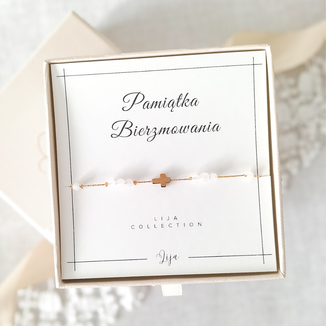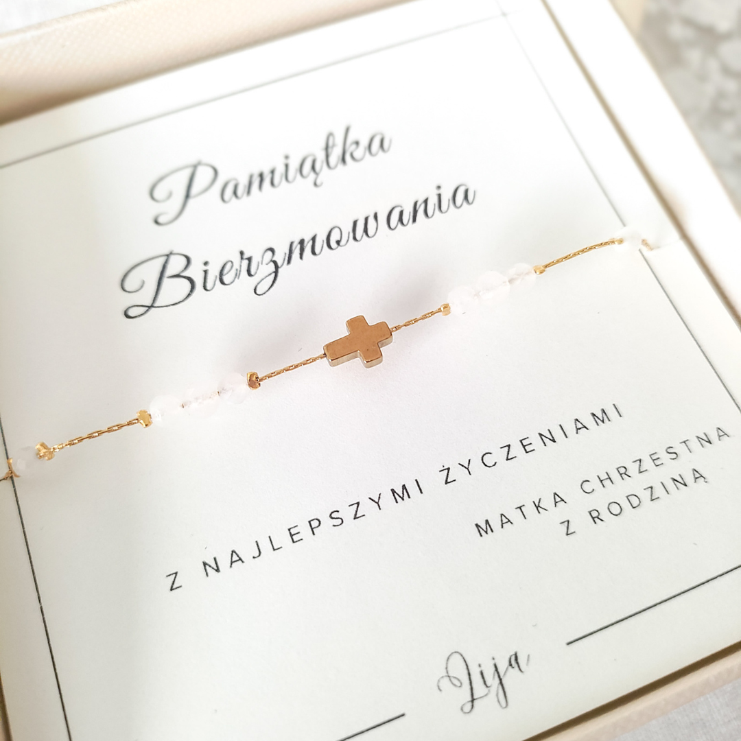 Pamiątka Bierzmowania - Bransoletka na łańcuszku z krzyżykiem - Kamień księżycowy