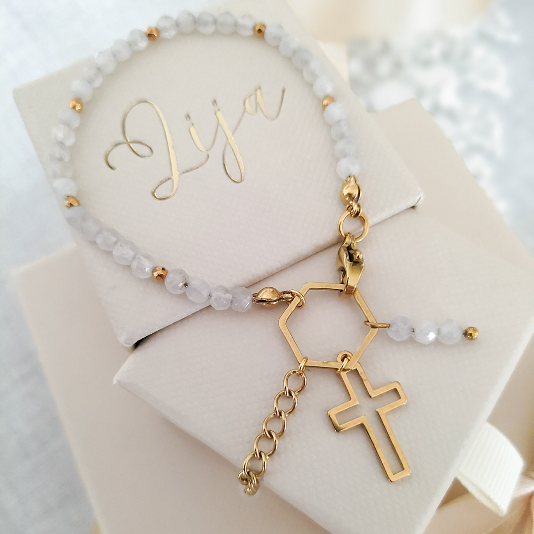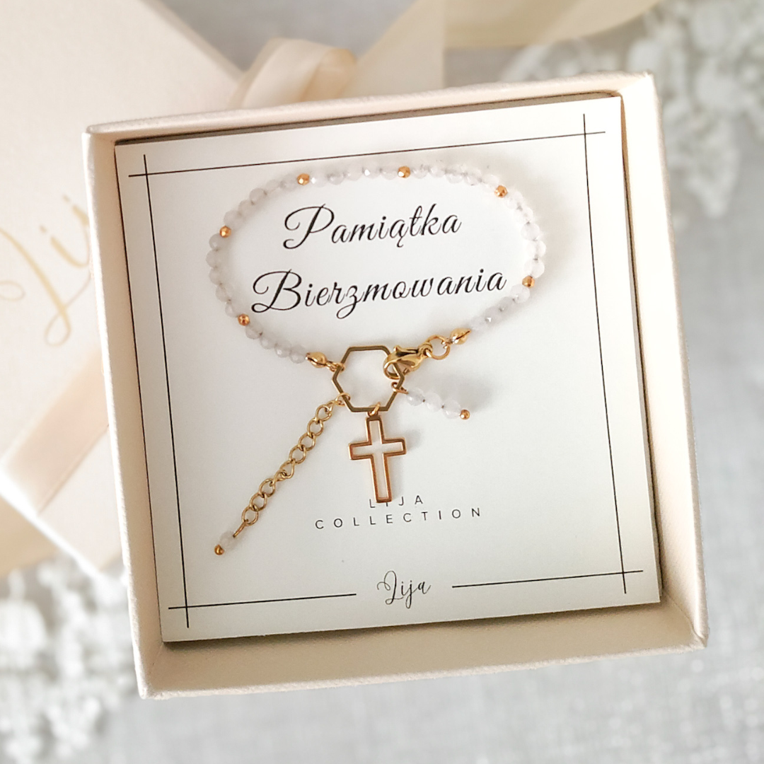 Pamiątka Bierzmowania - Bransoletka z kamieniem księżycowym i zawieszką krzyżykiem