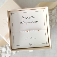 Chcesz aby bransoletka była gotowa do wręczenia na prezent? Zapakujemy ją w wybrany przez Ciebie wariant kolorystyczny: beżowy, pudrowy róż lub złoty. Prezent zapakowany będzie w kraftowy papier pakowy i przewiązany szeroką wstążką w wybranym kolorze. W opakowaniu znajdować się będzie pudełko jubilerskie z bransoletką, udekorowane wstążeczką oraz zabezpieczone wiórkami kraftowymi i dobraną kolorystycznie bibułą.