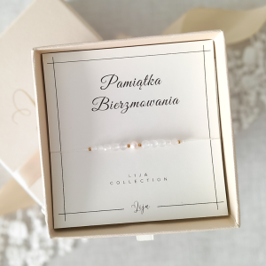 Bransoletka jest zapakowana w eleganckie pudełko jubilerskie w postaci szufladki z pozłacanym logo, w trzech wariantach kolorystycznych do wyboru: czarny, beżowy lub pudrowy róż. Wewnątrz pudełka znajduje się karteczka z napisem - Pamiątka Bierzmowania. Na odwrocie zaś można znaleźć opis właściwości danego kamienia.