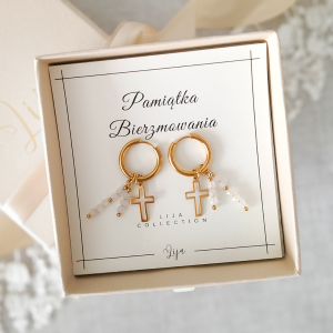 Pamiątka Bierzmowania - Kolczyki z krzyżykiem - Kamień księżycowy