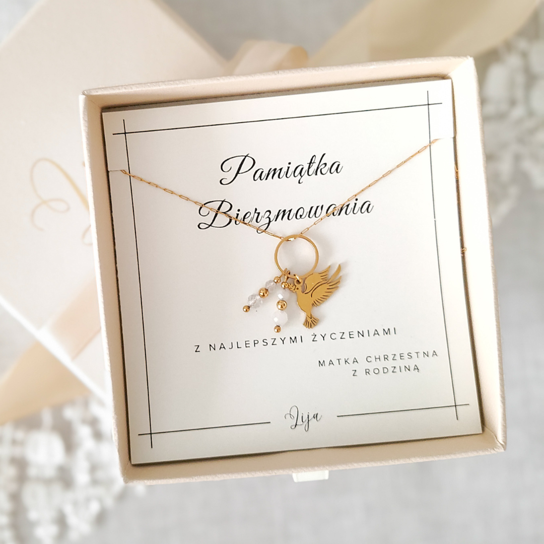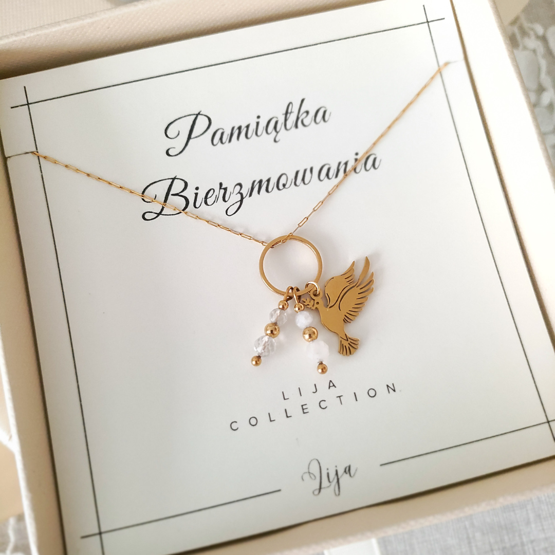 Łańcuszki Lija to idealny prezent na Bierzmowanie – elegancka, symboliczna biżuteria, która towarzyszy na co dzień. Kolekcja z gołąbkiem, stworzona specjalnie z myślą o tej wyjątkowej uroczystości, łączy delikatność, znaczenie duchowe i naturalne piękno kamieni.