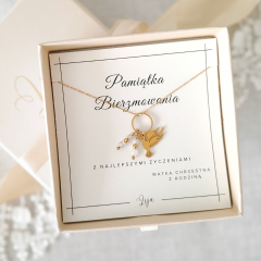 Łańcuszek jest zapakowany w eleganckie pudełko jubilerskie w postaci szufladki z pozłacanym logo, w trzech wariantach kolorystycznych do wyboru: czarny, beżowy lub pudrowy róż. Wewnątrz pudełka znajduje się karteczka z napisem - Pamiątka Bierzmowania. Na odwrocie zaś można znaleźć opis właściwości danego kamienia.