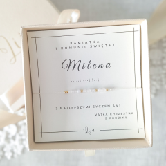 Bransoletka jest zapakowana w eleganckie pudełko jubilerskie w postaci szufladki z pozłacanym logo, w trzech wariantach kolorystycznych do wyboru: czarny, beżowy lub pudrowy róż. Wewnątrz pudełka znajduje się karteczka z napisem - Pamiątka I Komunii Świętej. Na odwrocie zaś można znaleźć opis właściwości danego kamienia.
