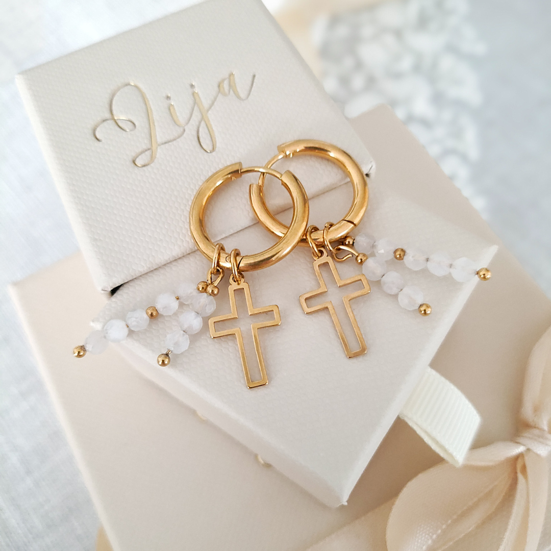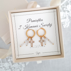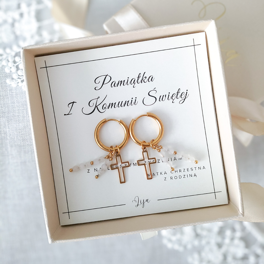 Pamiątka I Komunii Świętej - Kolczyki z krzyżykiem - Kamień księżycowy