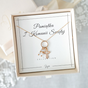 Pamiątka I Komunii Świętej - Łańcuszek z krzyżykiem - Kamień księżycowy, Kryształ górski