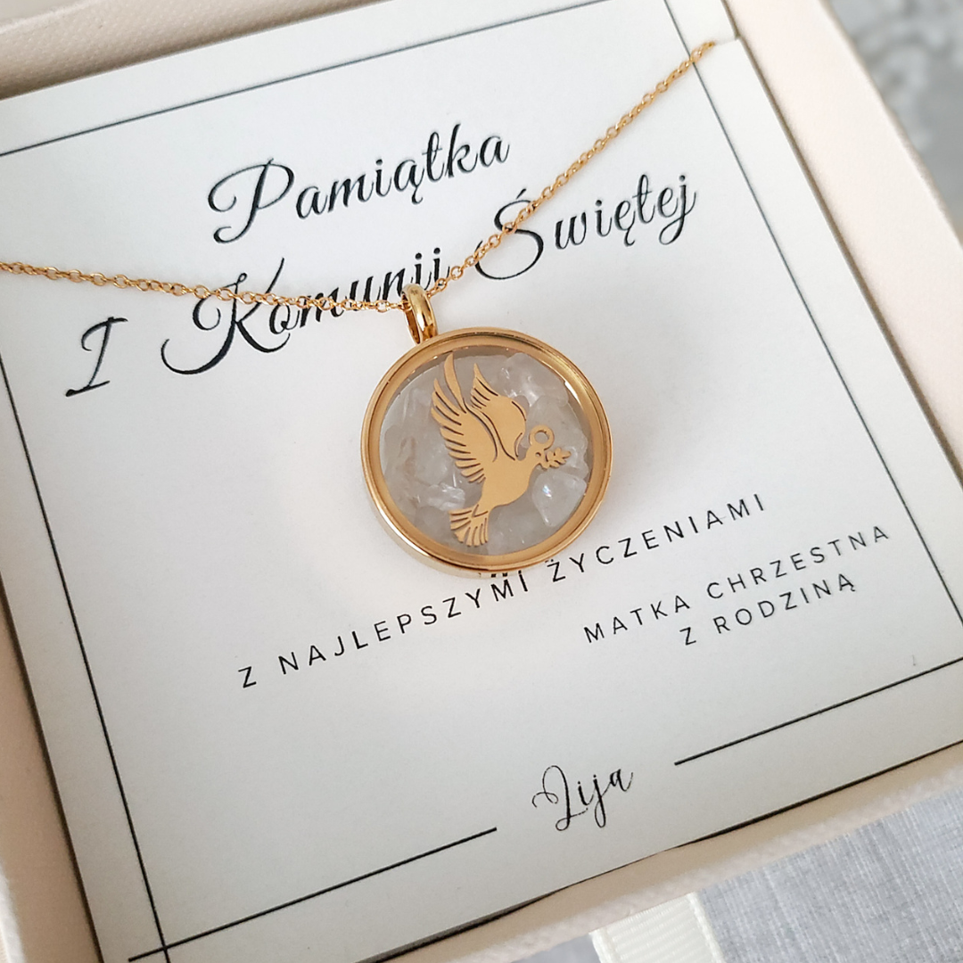 Pamiątka I Komunii Świętej - Sekretnik z gołąbkiem - Kryształ górski
