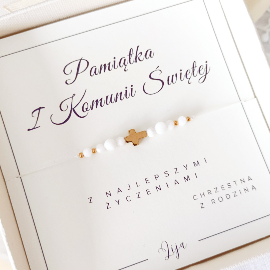 To Ty decydujesz o każdym szczególe — wybierasz imię, kamień oraz kolor nici, a my tworzymy dla Ciebie unikalną, spersonalizowaną bransoletkę, idealną jako pamiątka I Komunii Świętej.