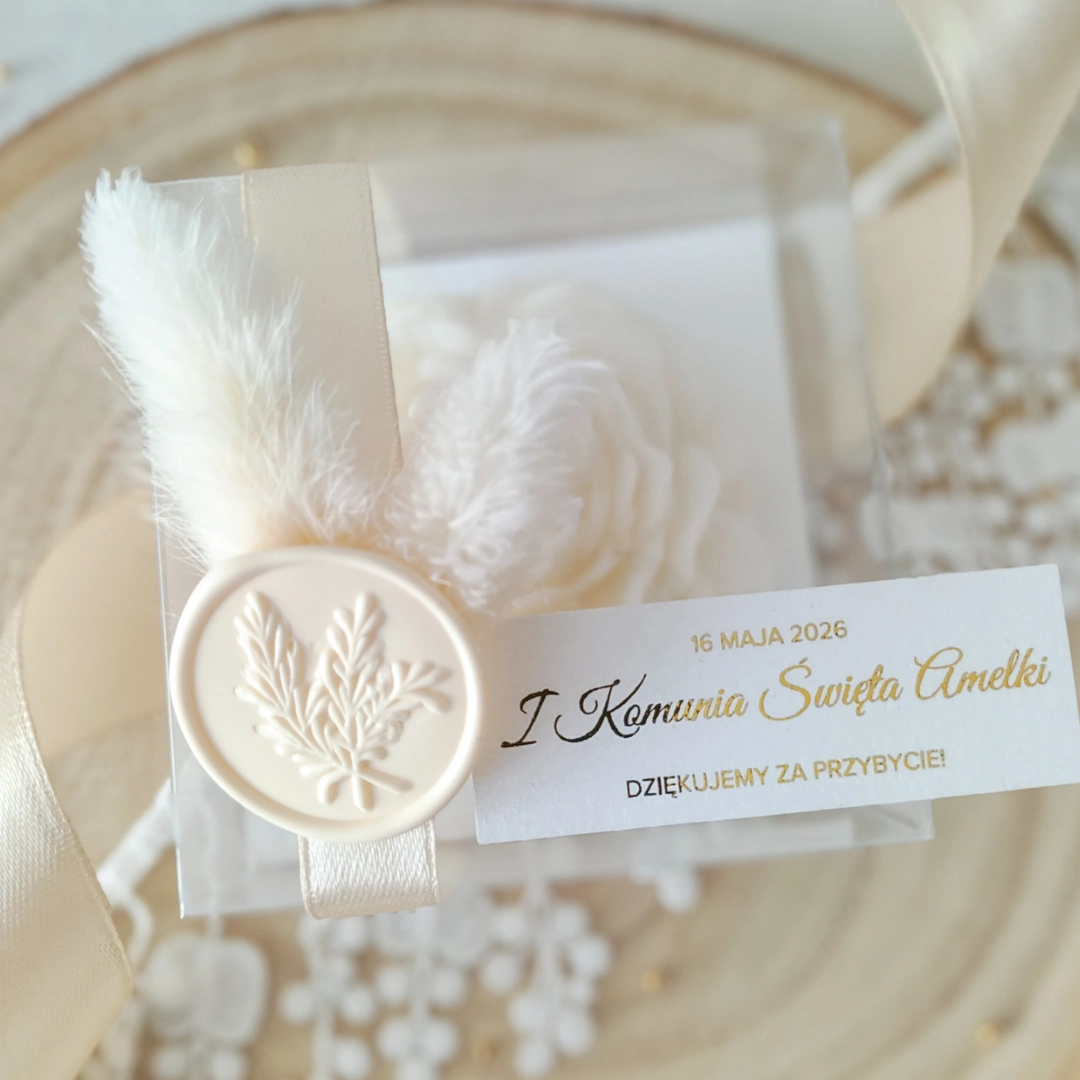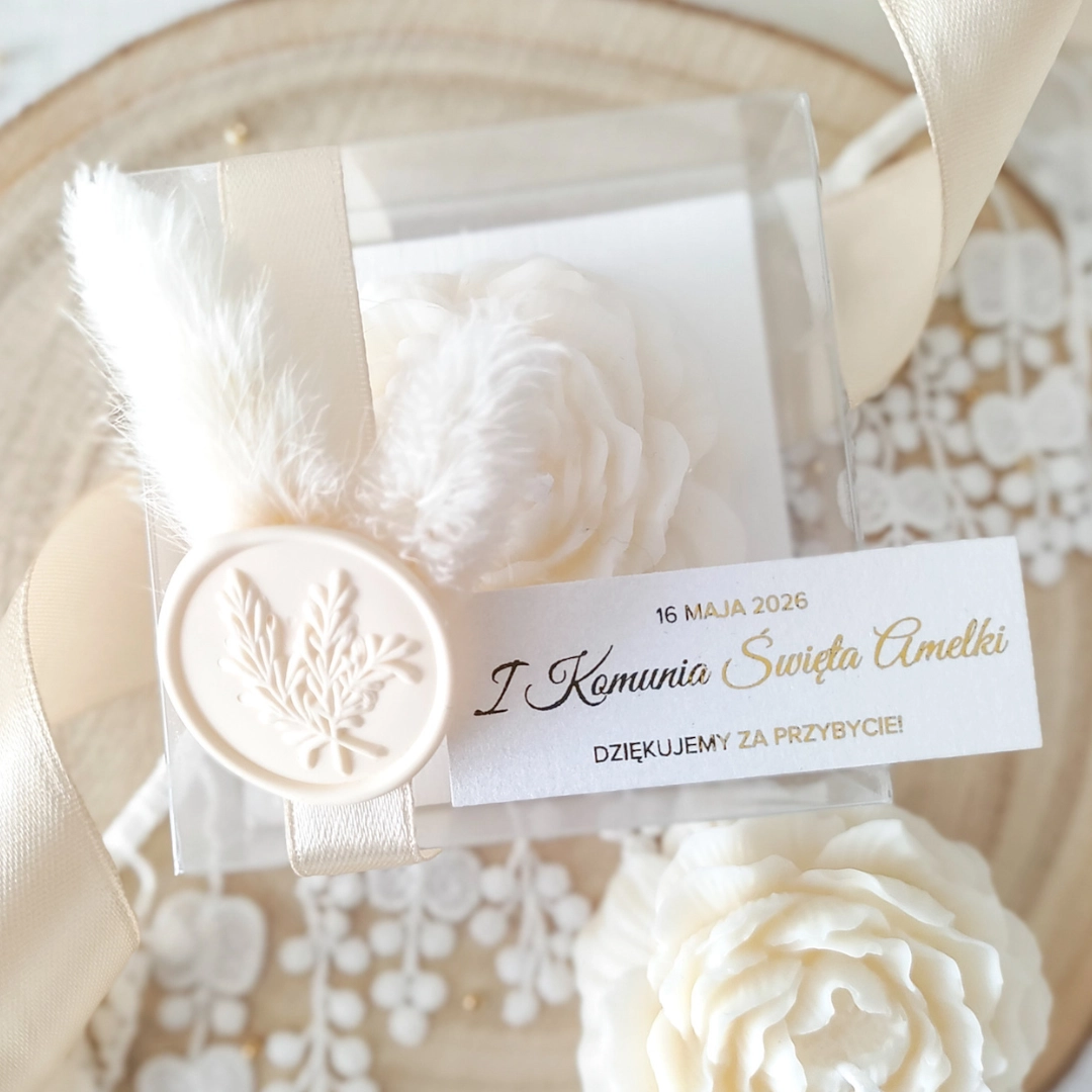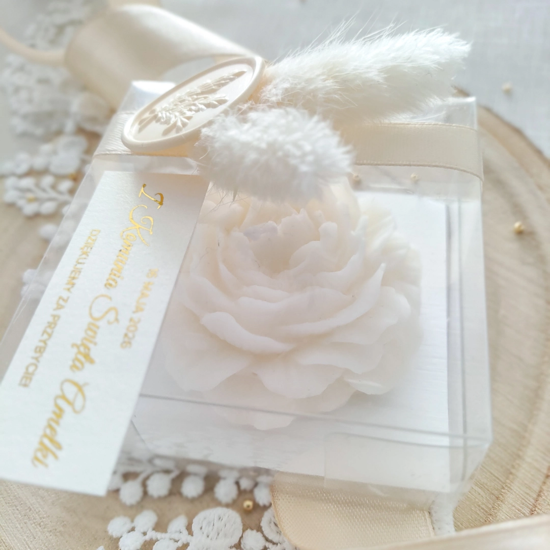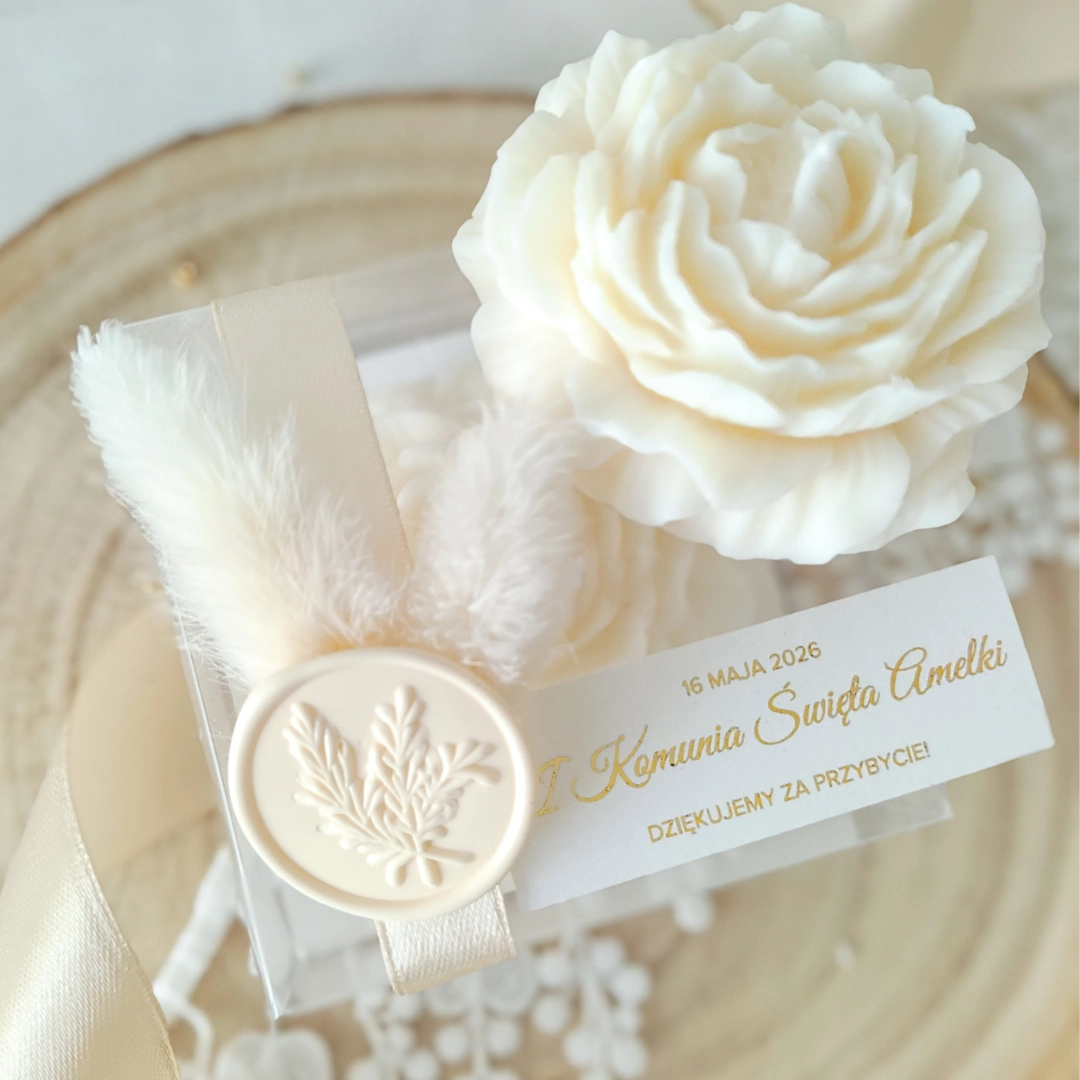 Stworzona z myślą o wyjątkowym dniu, ta urocza świeczka w kształcie piwonii to elegancki i pełen wdzięku upominek dla gości I Komunii Świętej. Umieszczona w przezroczystym pudełku, ozdobiona delikatną dekoracją oraz personalizowanym, pozłacanym bilecikiem z datą uroczystości i imieniem dziecka, staje się piękną pamiątką, która na długo pozostanie w sercach obdarowanych.