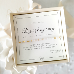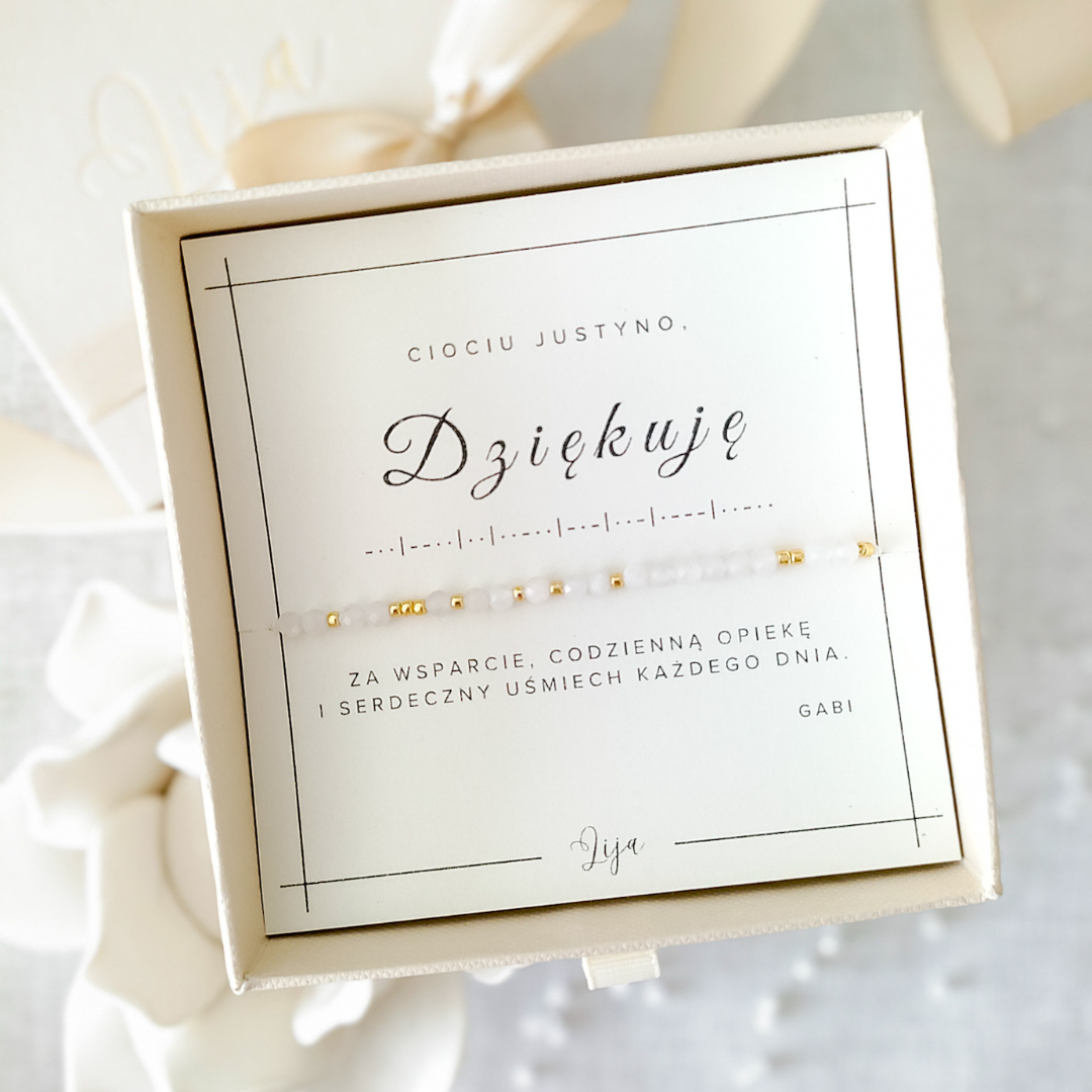 Bransoletka z zakodowanym słowem DZIĘKUJĘ lub DZIĘKUJEMY to idealny prezent na zakończenie przedszkola, żłobka, szkoły czy na Dzień Nauczyciela. Świetnie sprawdzi się jako podziękowanie dla pani ze szkoły, pani z przedszkola czy dla cioci ze żłobka. To oryginalna i piękna biżuteria, która wyrazi Twoją wdzięczność w wyjątkowy sposób. To Ty wybierasz kamień oraz kolor nici, a my stworzymy dla Ciebie unikalny prezent - zaprojektowaną przez Ciebie bransoletkę!